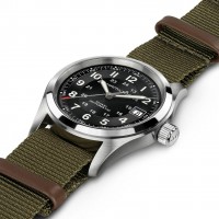 Discover the limited edition Khaki Field Automatic 38mm, as we continue to push what’s possible at the intersection of watchmaking, creativity and storytelling and collaborate with “Call of Duty: Black Ops 7”. Worn by Axel Vermaak in the game, The rugged, Swiss-made timepiece features a stainless steel case, black dial with multi-textured finishings and Super-LumiNova®-coated hands for low-light visibility. A durable khaki green NATO strap reinforces its tactical edge, while the H-10 automatic movement delivers an 80-hour power reserve, prepared for any mission.