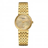 The harmonious design of the Rado Florence calls to mind the elegant domes and towers of the city from which the collection takes its name. Powered by a reliable three-hand Quartz Rado calibre R079 movement, this watch ensures greater accuracy and resistance to shocks. The 30 mm watch has an edge-to-edge-bevelled, curved sapphire crystal. The watch boasts a polished yellow gold coloured PVD coated stainless steel case, crown, bezel and case back. The bracelet made of polished yellow gold coated stainless steel completes the overall appearance of this classic timepiece. The mother-of-pearl dial with 12 diamonds, emphasised with the printed "jubilé" logo, matches perfectly with the yellow gold coloured hands. The watch is water resistant down to 50 m and is also available in L size, which makes it an ideal couples’ watch.