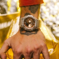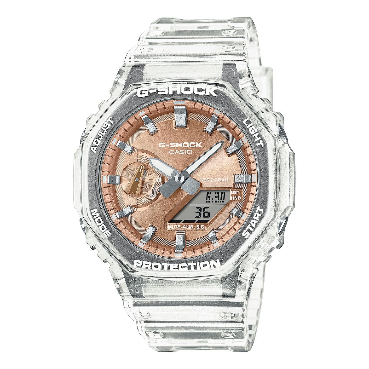 The GA2100 with octagonal bezel is paired with a dial finished in metallic vapor deposition in popular color — rose gold — offset by a translucent band for a confidently cool look.