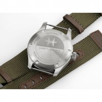 The Khaki Field Mechanical Power Reserve 40mm honors the heritage design and essential functionality of the Khaki family, while introducing modern features and the latest in watchmaking technology and innovation. With a new manual-winding H-23 movement, developed by ETA exclusively for Hamilton, it allows (for the first time) for the 80-hour power reserve to be visualized directly on the dial. Fitted with a rugged khaki green NATO strap, the white dial proudly displays "power reserve 80 hours" and shows "F" for full and "E" for empty, to underscore this exceptional and utility-focused feature.